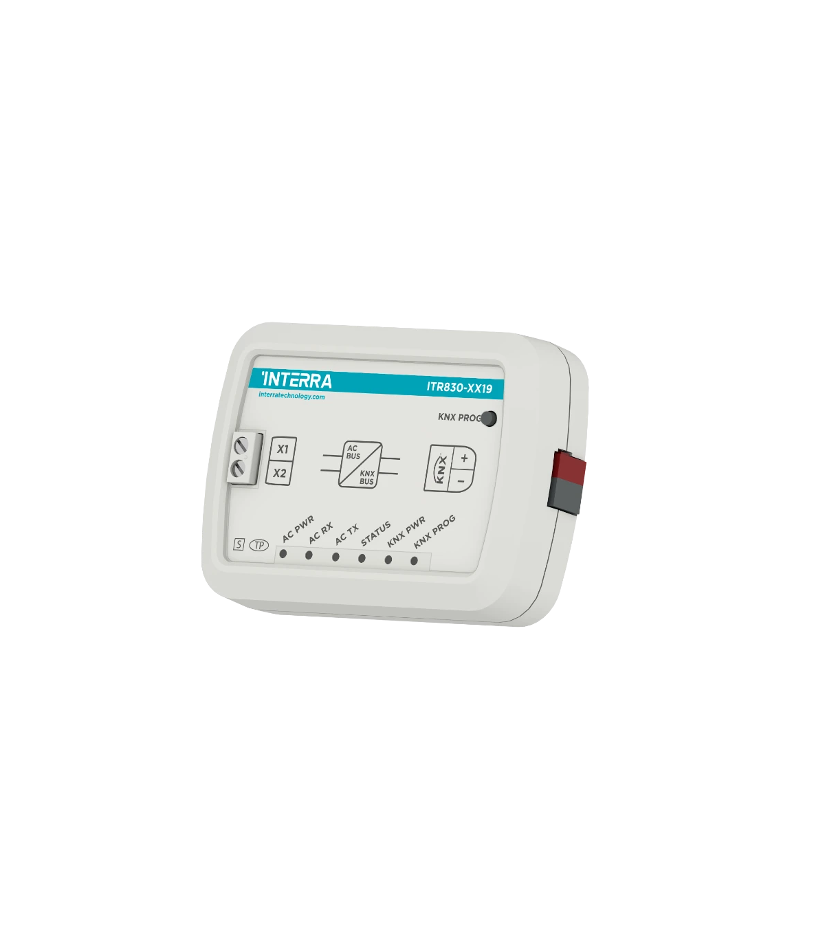ITR830-XX19 este un gateway de aer condiționat utilizat pentru monitorizarea și controlul tuturor parametrilor de funcționare ai aparatelor de aer condiționat Carrier prin intermediul liniei de comunicatie KNX. Carrier VRF AC - KNX Gateway este compatibil cu modelele din tipurile VRF clasificate pe lista de compatibilitate publicată de Interra. Carrier VRF AC - KNX Gateway are o caracteristică de instalare ușoară și poate fi instalat în interiorul unității interioare AC proprii sau într-o locație adecvată departe de aparatul de aer condiționat, se conectează pe o parte direct la circuitul electronic al unității interioare AC și pe cealaltă parte direct la magistrala KNX.