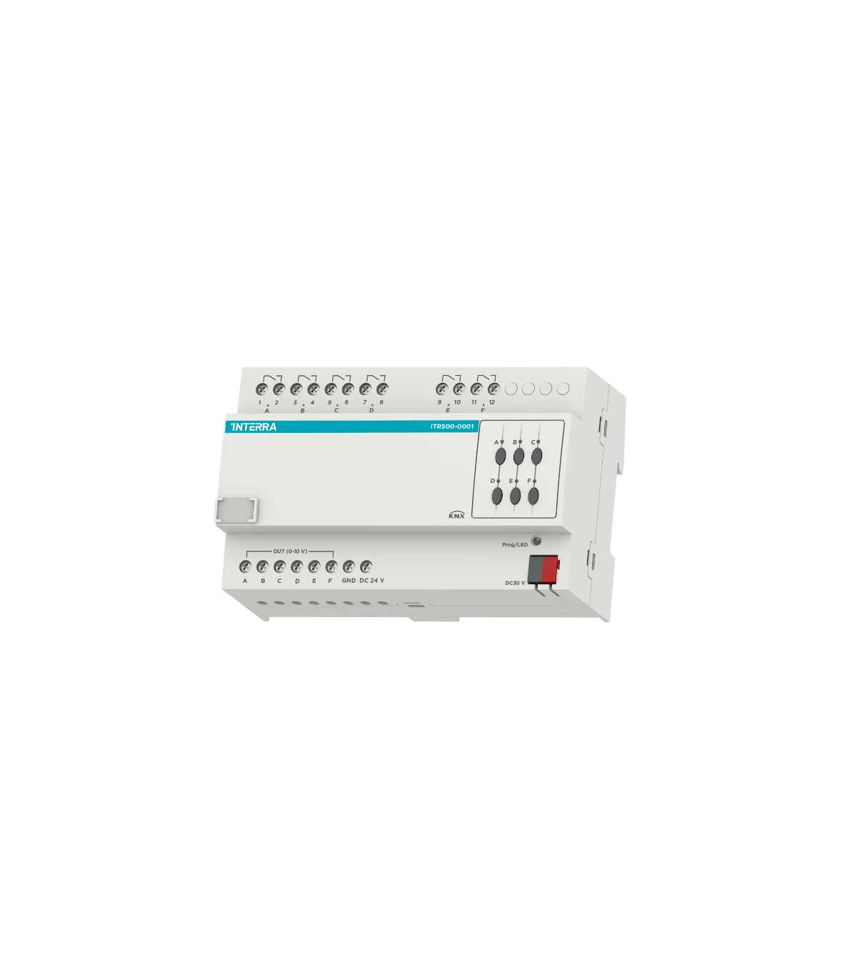 Controlerul de balast Interra cu 6 canale KNX acceptă reglarea luminii 0-10V, 1-10V și 2-10V pe canal. Ieșirile sunt echipate cu un releu de 10A pentru controlul pornit/oprit, iar butoanele permit controlul manual al comutării și reglajului. Tipurile de control includ atât semnale de intrare, cât și semnale de ieșire, astfel încât ambele tipuri de balast de absorbție și de ieșire pot fi conectate la acest modul.