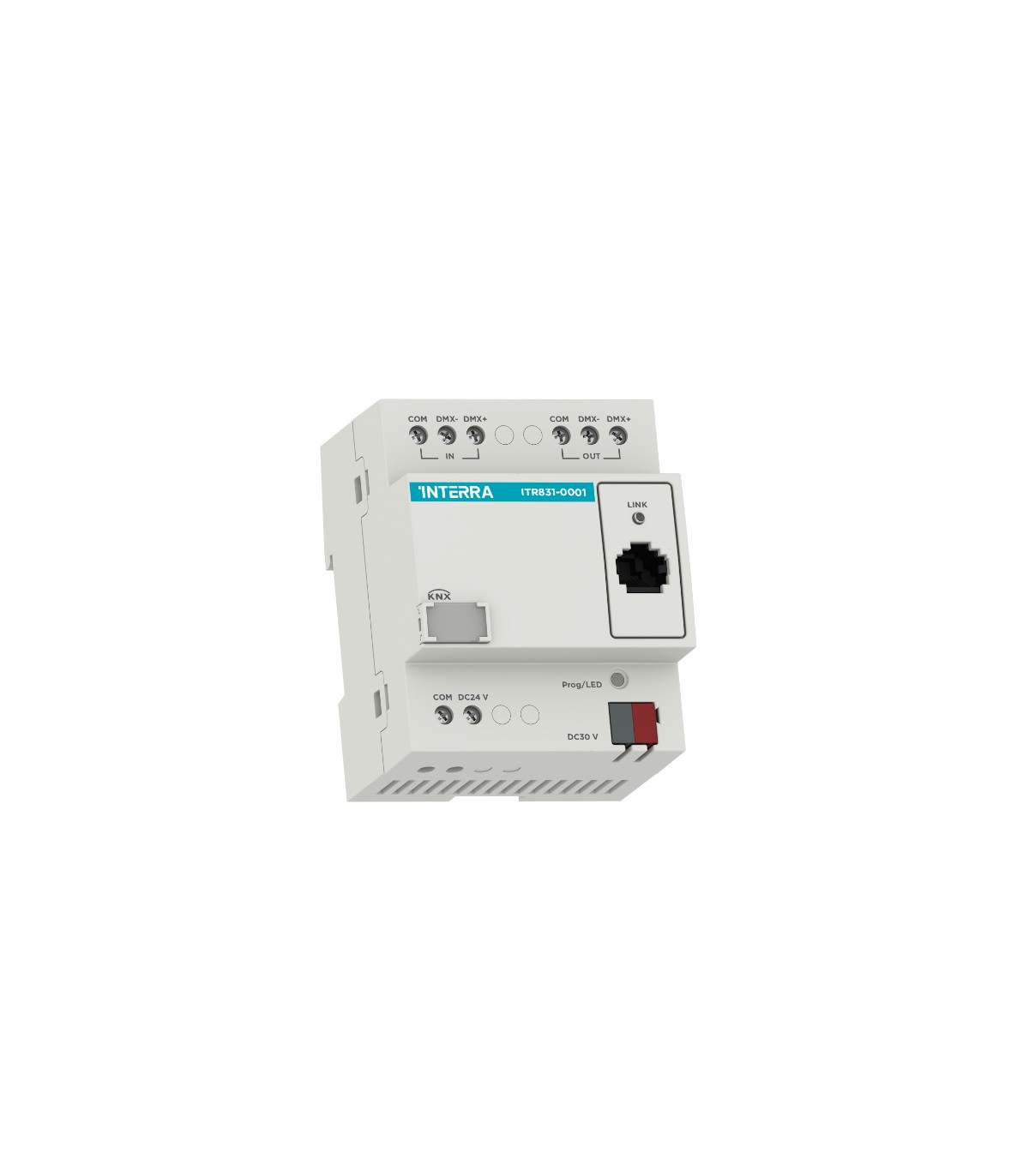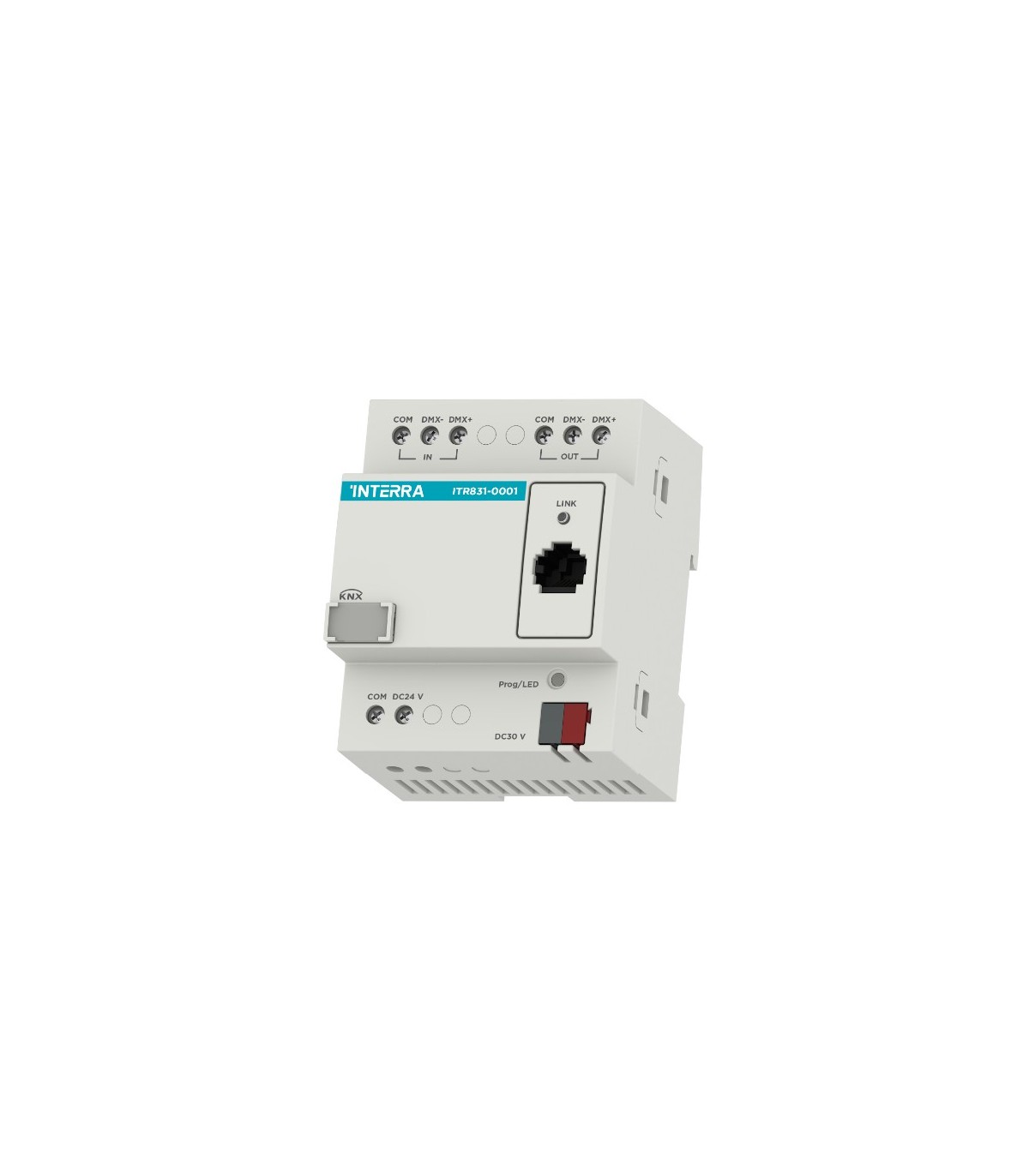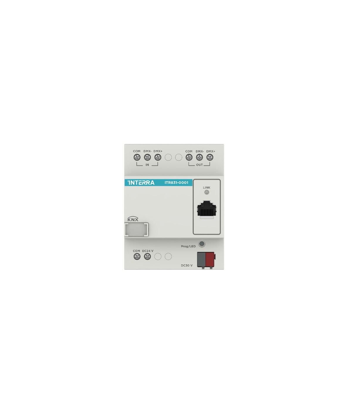 ITR831-0001 - Interra KNX - DMX Gateway acceptă control în două sensuri și poate înregistra, reda și șterge programe DMX. Cu timpi de înregistrare de până la 4 ore, Interra KNX - DMX Gateway poate fi utilizat pe scară largă pentru a controla dispozitive cu un port de protocol DMX încorporat pentru controlul culorii LED, cum ar fi lumina computerului, lumina cu cap mobil, lumina laser etc.