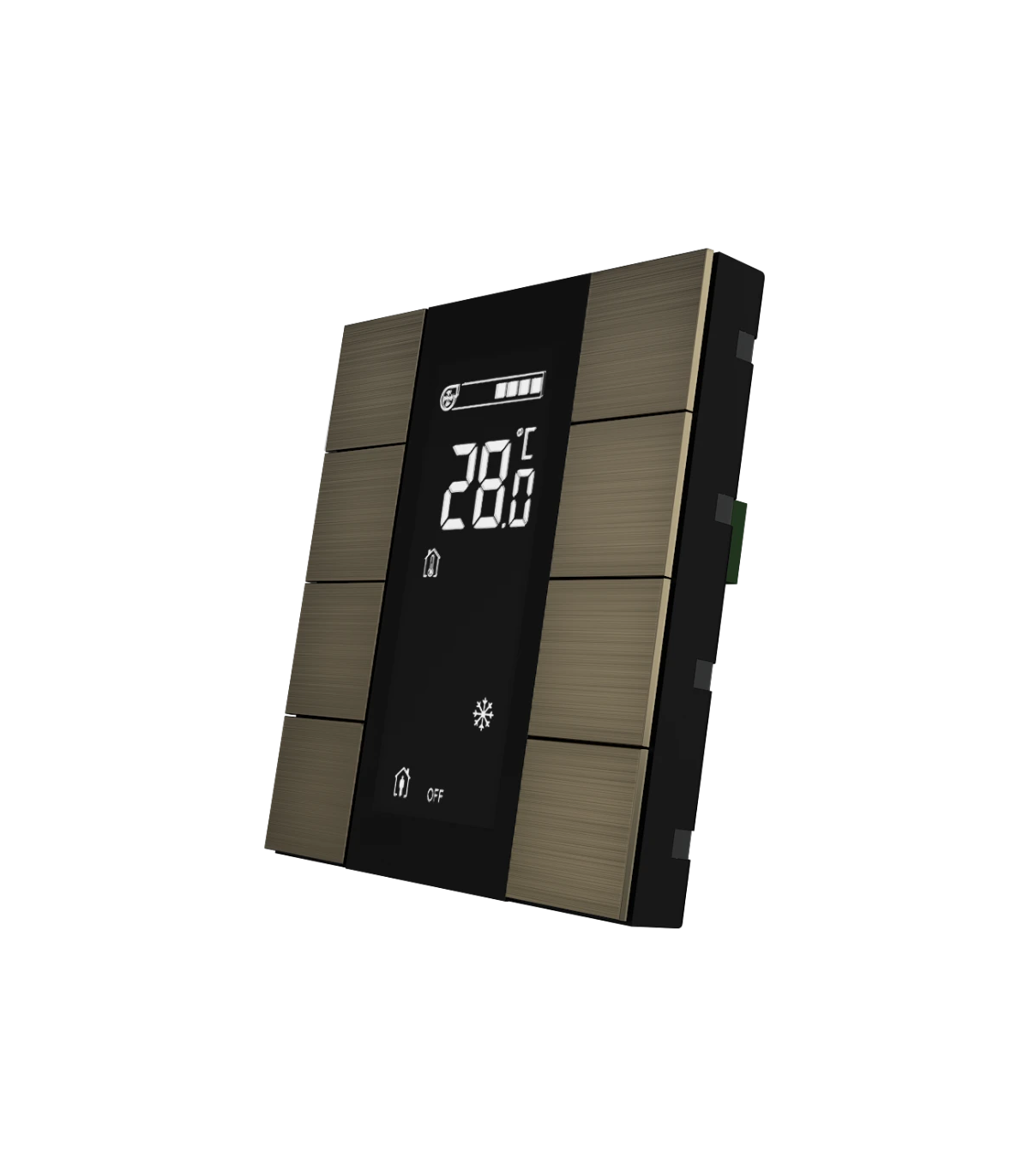 Fiecare buton este echipat cu LED-uri RGB cu intensitate luminoasa reglabila in combinatii de culori albastru/verde sau alb/rosu pentru feedback sau vizualizare, iar modelele LCD sunt echipate cu tehnologia VA-Display. Există 2 butoane ascunse cu apăsare scurtă și evenimente de apăsare lungă, situate în sus și în jos sub cadrul ecranului LCD, făcându-l un dispozitiv unic pentru a controla toate funcțiile termostatului prin butoanele LCD. Oferă o mare flexibilitate a proiectului, astfel încât alte butoane pot fi aranjate pentru alte comenzi.