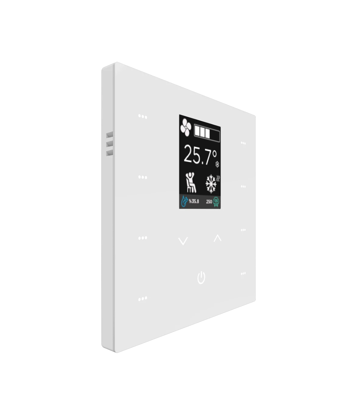 Interra iX2 este un dispozitiv de control de cameră montat pe perete cu un senzor integrat de temperatură, umiditate, calitatea aerului și luminozitate. iX2 poate controla modurile de funcționare de încălzire și răcire cu funcții de termostat în 2 puncte, continuu și PWM.