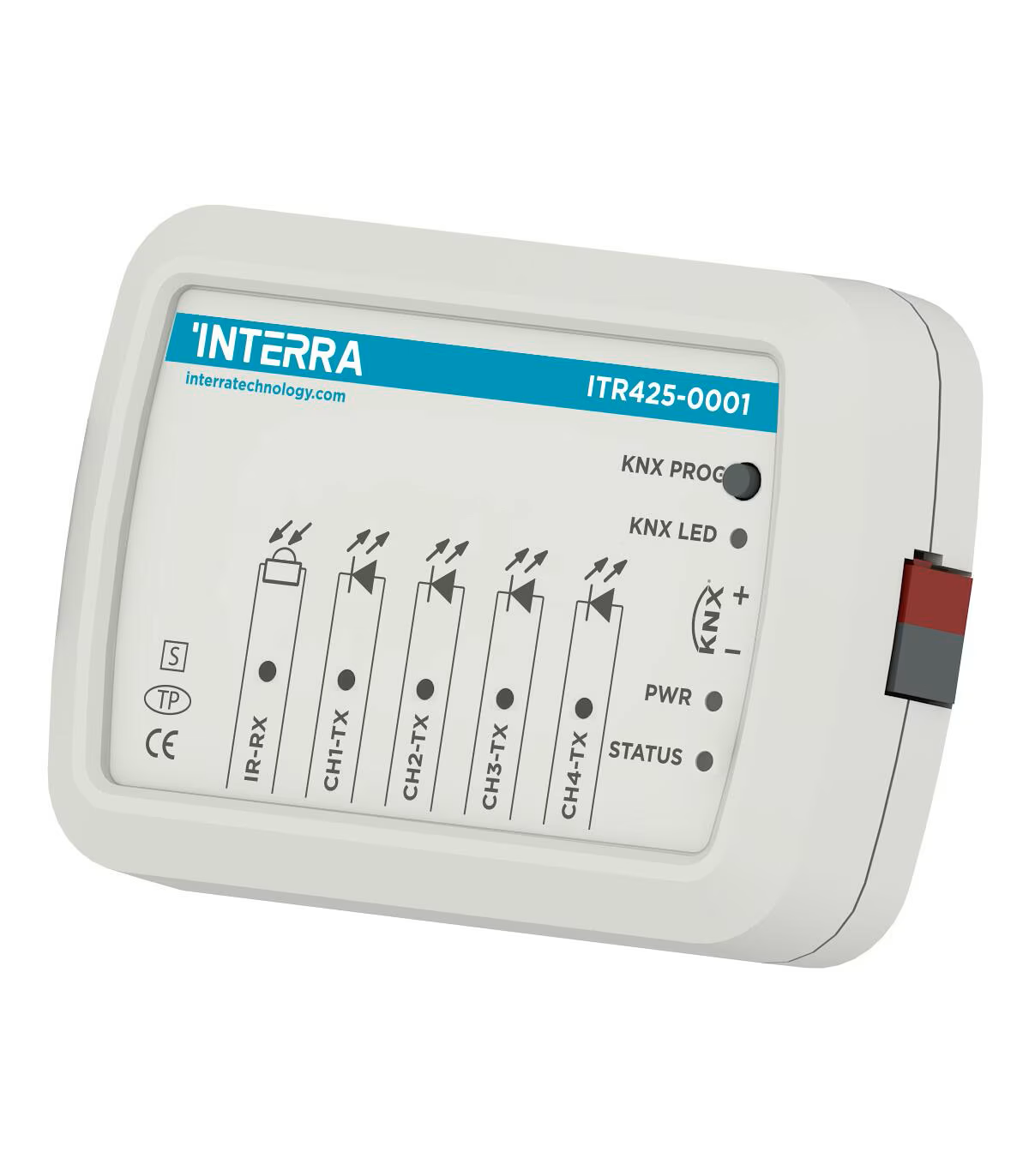 Interra KNX-IR Gatweway este un transmițător de semnal IR multifuncțional. Vă permite să gestionați toate dispozitivele electronice cu infraroșu, cum ar fi TV, DVD, aer condiționat. Există cinci moduri diferite în total: modul unic, modul repetat, modul secvenţial, controlul climatizării şi detectarea curentului. Transmițătorul IR Interra are maximum 150 de coduri IR universale și 81 de coduri IR AC. Are 4 interfețe de răspândire: A, B, C, D. Interra IR Gateway este produs în conformitate cu standardul UE în ceea ce privește compatibilitatea EMC și siguranța electrică.