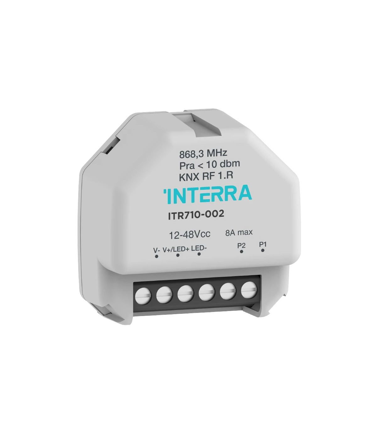 Interra KNX RF S-Mode Wireless 1 Channel Led Strip Dimmer Actuator este utilizat pentru benzi cu LED-uri de joasă tensiune dintr-o singură culoare.